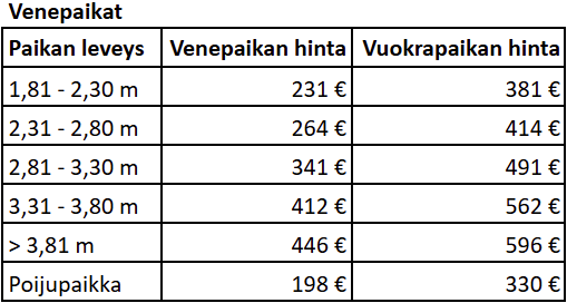 - Veneen, pukin, maston tai muun irtaimiston säilyttäminen sataman alueella ohjeiden vastaisesti 100€, tai toteutuneet siirtokustannukset, mikäli korkeammat.